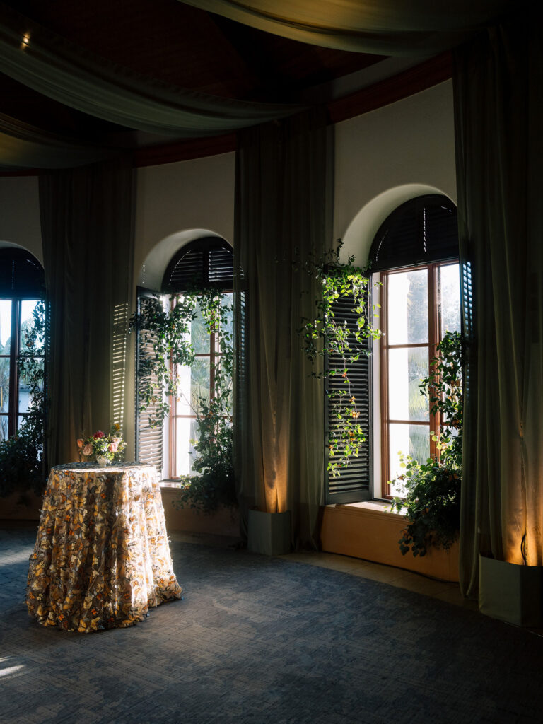 • Romantic Drapery: To soften the architecture of the Rotunda, we hung sweeping swags of olive green chiffon. The fabric caught the ocean breeze, making the entire room feel like it was breathing.