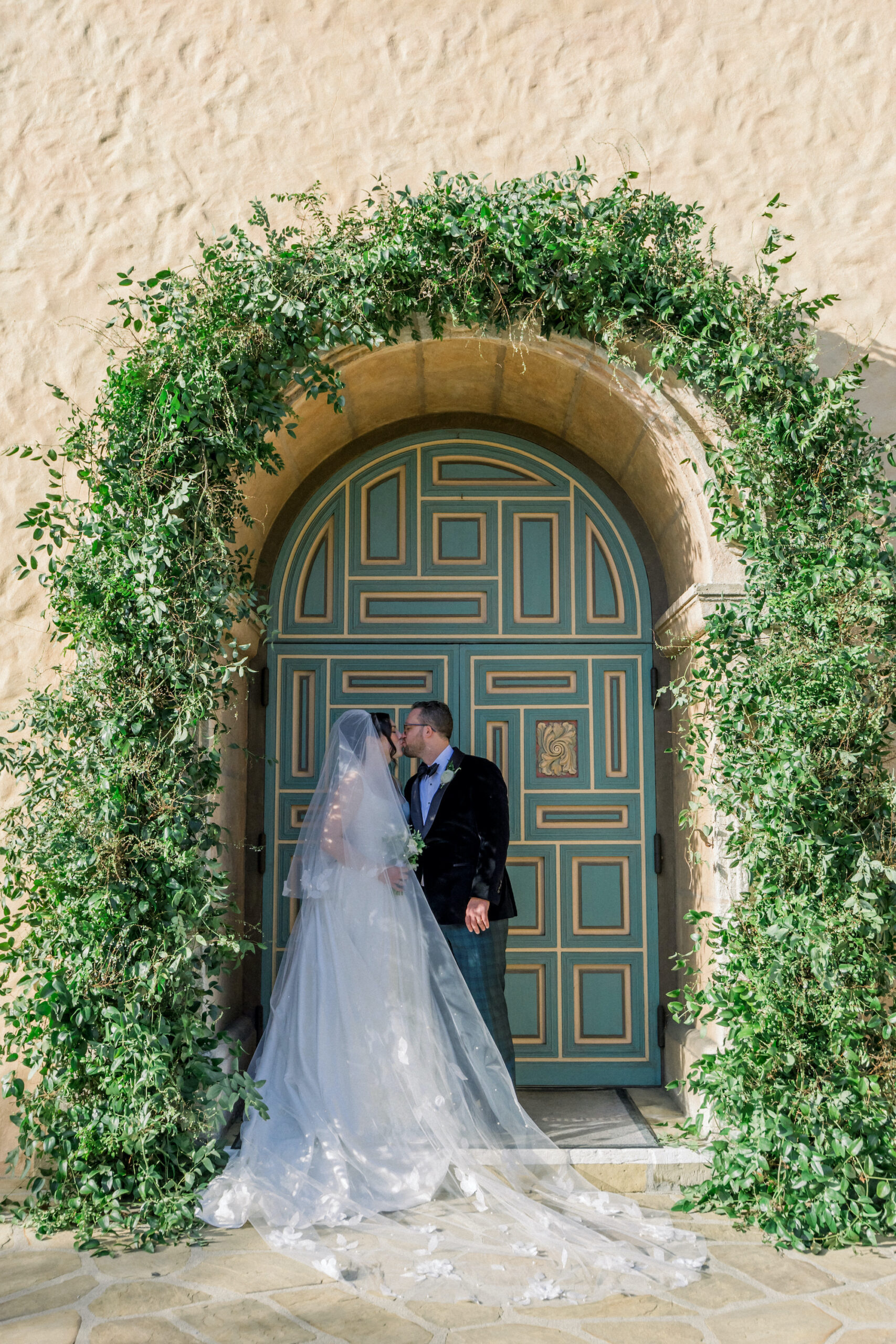 Our journey began at the stunning church, Our Lady of Mount Carmel in Montecito. The church itself is a vision, but to elevate the entrance, we designed an oversized arch that framed the doors. Lush greenery created a dramatic and welcoming statement. It was the perfect prelude to the beautiful ceremony within.