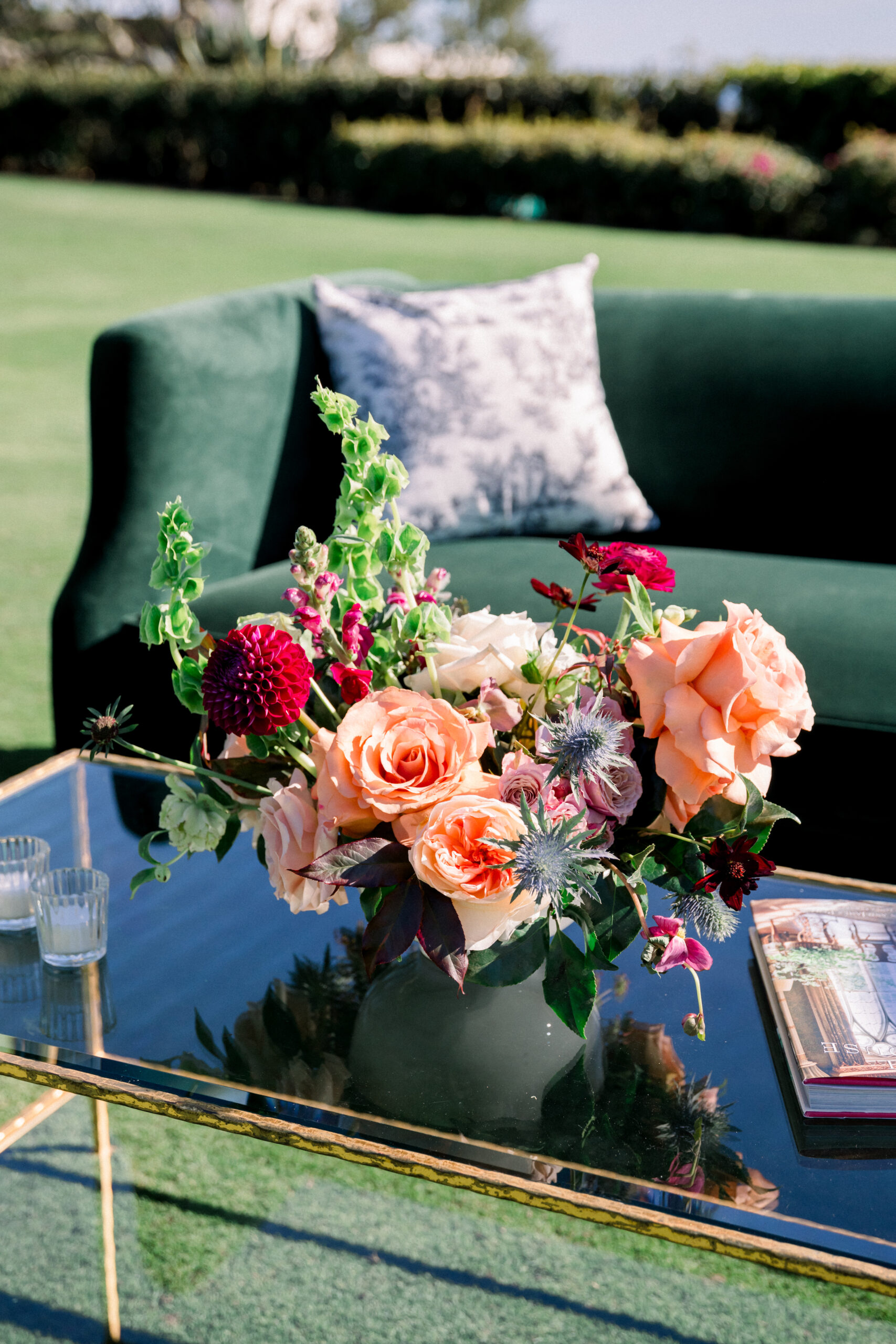Cocktail Hour with Toile Motifs, A Celtic Fold Band, and Guinness on Tap!From there, we transitioned to the iconic Montecito Club, where the real transformation began. The couple’s desire to evoke the feeling of an Irish castle guided every design decision. The cocktail hour, held on the lawn overlooking the breathtaking Santa Barbara coastline, was a masterclass in sophisticated comfort. We styled the bar with black and white toile patterned wallpaper and elegant brass lamps, creating a cozy yet chic ambiance. Dark green velvet lounges, adorned with toile patterned pillows and abundant, lush florals, provided comfortable seating for guests to mingle, drink Guinness on tap, and enjoy the stunning views.