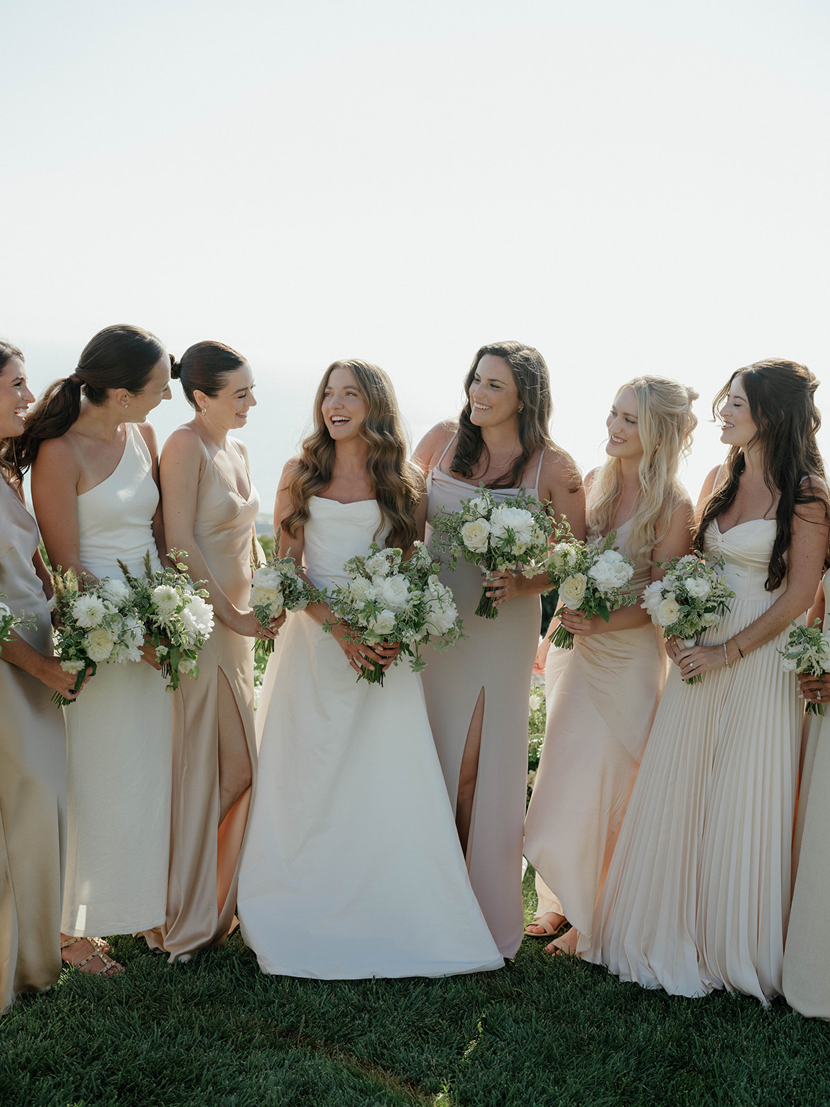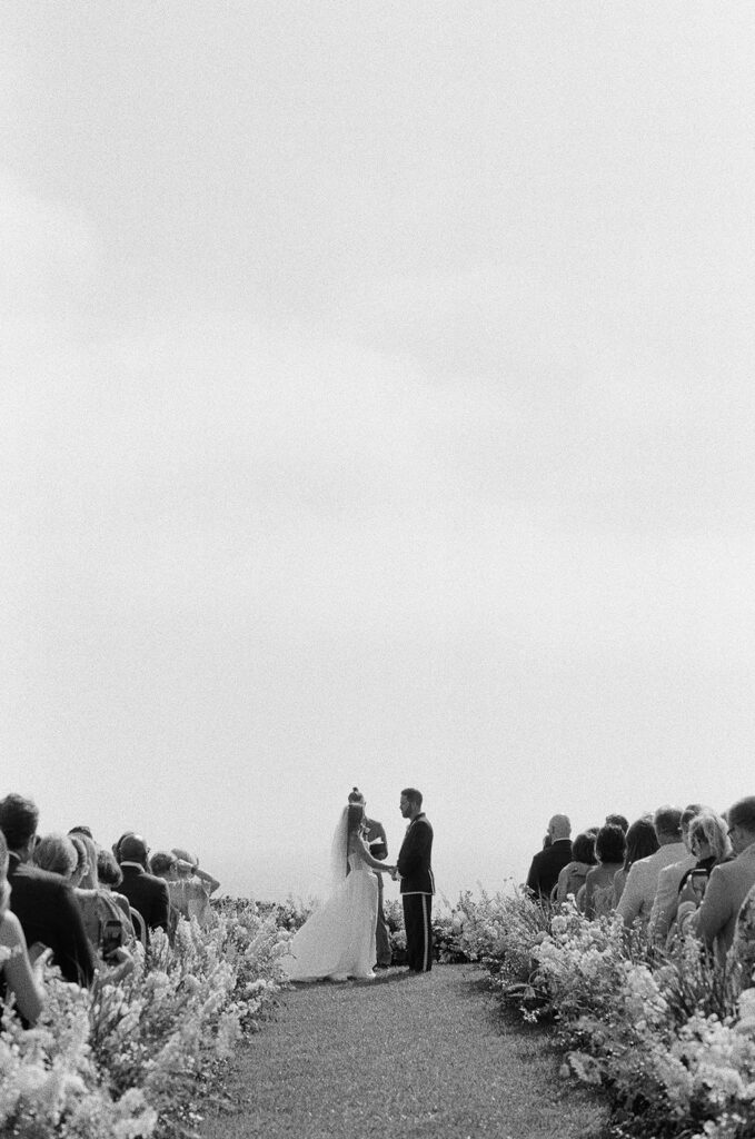The ceremony took place on a lawn overlooking the water. To avoid obstructing the horizon, we designed a low, lush meadow of textured blooms. This “grown-from-the-earth” floral installation framed the couple without competing with the natural scenery. We focused on varied floral shapes and heights to create depth within the organic design.